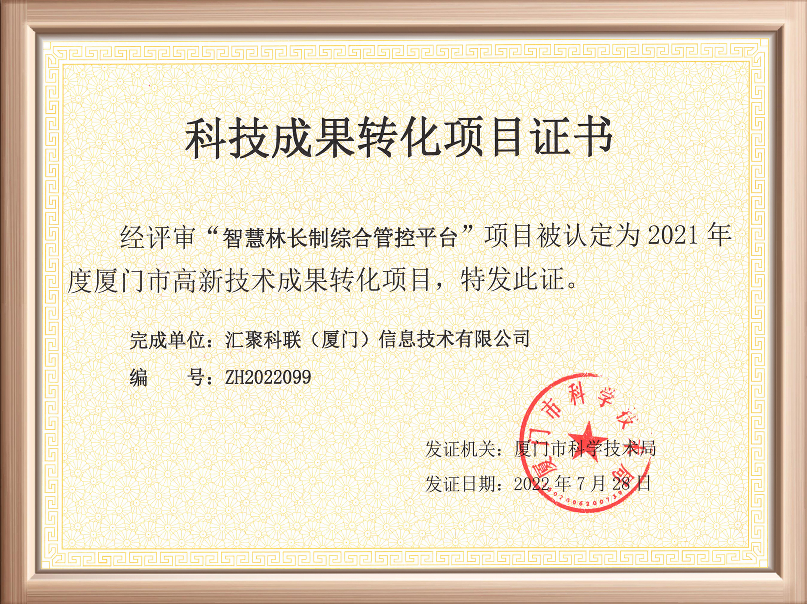 近日,匯聚科聯收到廈門市科技局頒發的“科技成果轉化項目證書”,公司“智慧林長制綜合管控平臺”經過評選,成功被認定為2021年度廈門市高新技術成果轉化項目。